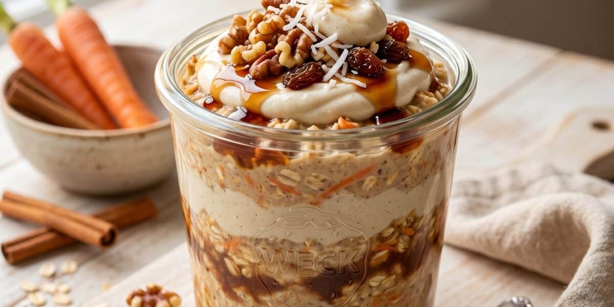 Carrot Cake Overnight Oats deliver sweet cinnamon, nutty raisins, and shredded carrots in a creamy breakfast bowl. Chia seeds and yogurt add protein, while overnight soaking creates a cake-like texture. Ready in 4 hours.