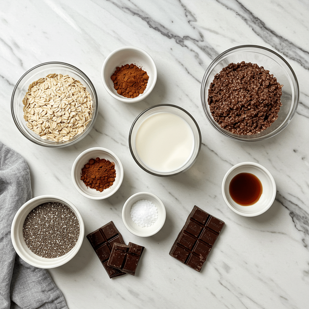 Chocolate smash-top oats ingredients on a modern kitchen counter