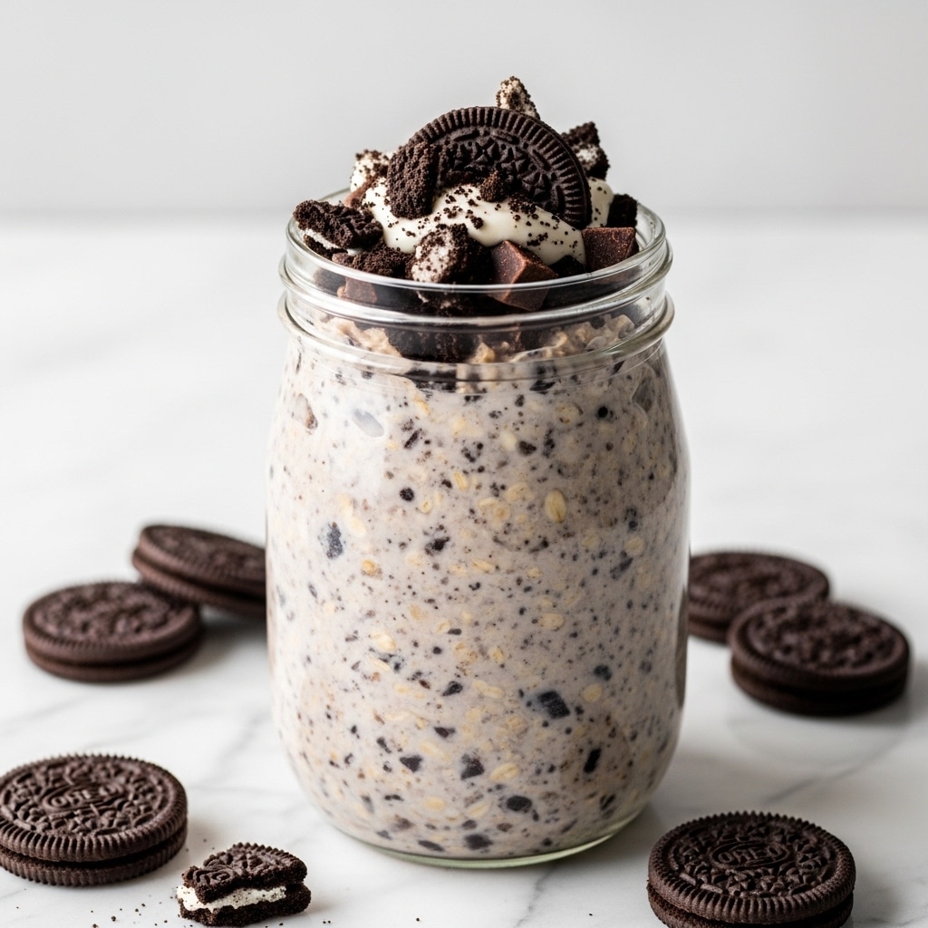 Cookies and cream overnight oats combine creamy oats with crushed chocolate sandwich cookies for a fun, dessert-inspired breakfast. This easy make-ahead recipe blends oats, milk, yogurt, and cookie pieces for a sweet and satisfying start to the day.