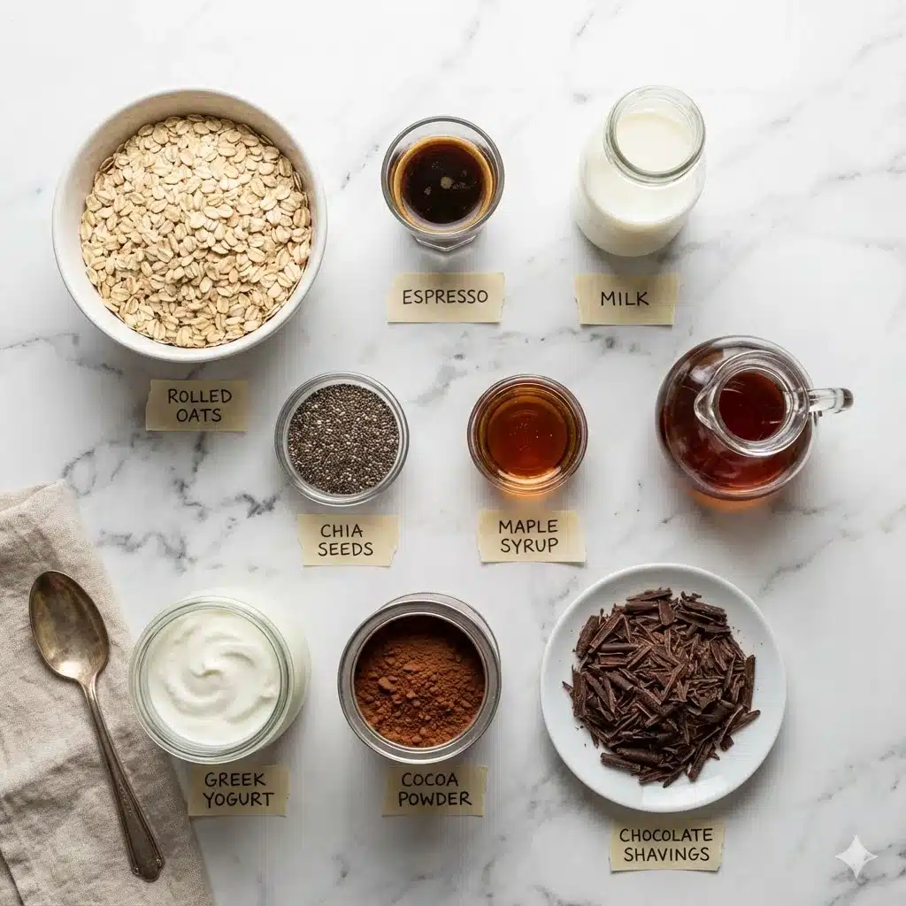 To make tiramisu overnight oats with protein, you really only need a small handful of ingredients, and each one kinda pulls its own weight. the base is old fashioned rolled oats. they soak overnight without turning mushy, which is nice, and they’re slow digesting so you stay full longer. simple, but solid.