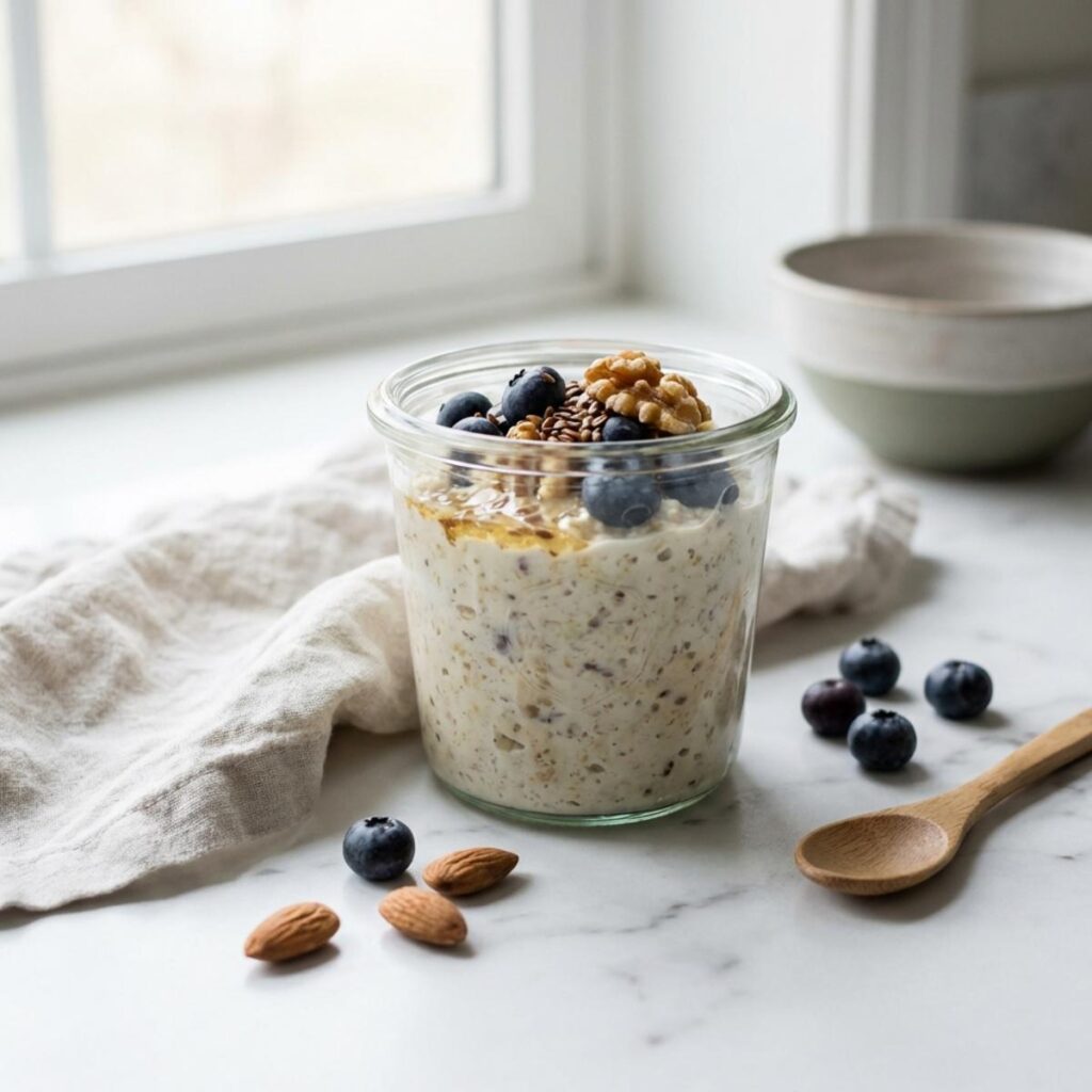Making your overnight oats for perimenopause is incredibly simple, taking just minutes to prepare the night before. This minimalist process helps you stay consistent with nourishing yourself, even during busy or tired mornings.