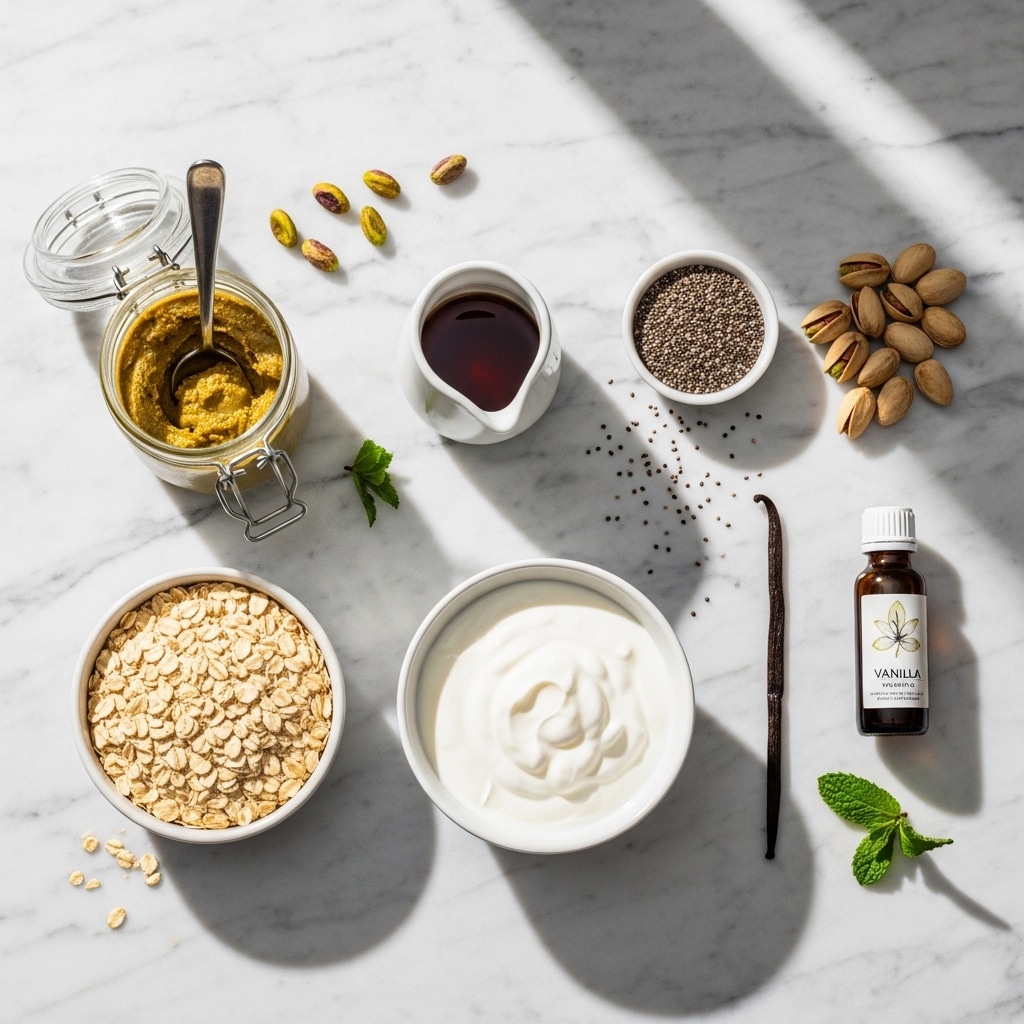 At its core, you’ll need rolled oats, unsweetened Greek yogurt, pistachio milk or pistachio butter, a natural sweetener like maple syrup or honey, and a touch of vanilla. The yogurt adds protein and tang, giving it that “pudding-like” richness. If you want even more creaminess, you can fold in mashed banana or even blended cottage cheese.