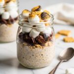 S’mores Overnight Oats bring the magic of a campfire treat into your breakfast jar — rich cocoa oats layered with mini marshmallows, chocolate chips, and crushed graham crackers. A cozy, no-cook make-ahead breakfast that tastes like summer around the fire, ready to grab from the fridge every morning.
